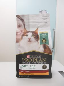 ピュリナの特別なキャットフード、プロプラン・リブクリアをご紹介します。このフードは人の猫アレルギーを緩和する効果があることが特徴です。猫は好きだが、一緒にいると鼻がムズムズ、肌が痒くなるという飼い主様にぜひ試していただきたいです。猫の唾液の成分にアレルギーを起こす物質が含まれていて、卵由来のたんぱく質がそれを中和するそうです。完全に猫アレルギー症状がなくなるわけではありませんが、症状が軽減したという感想は聞いています。猫好きな猫アレルギーの飼い主様はぜひご相談ください。